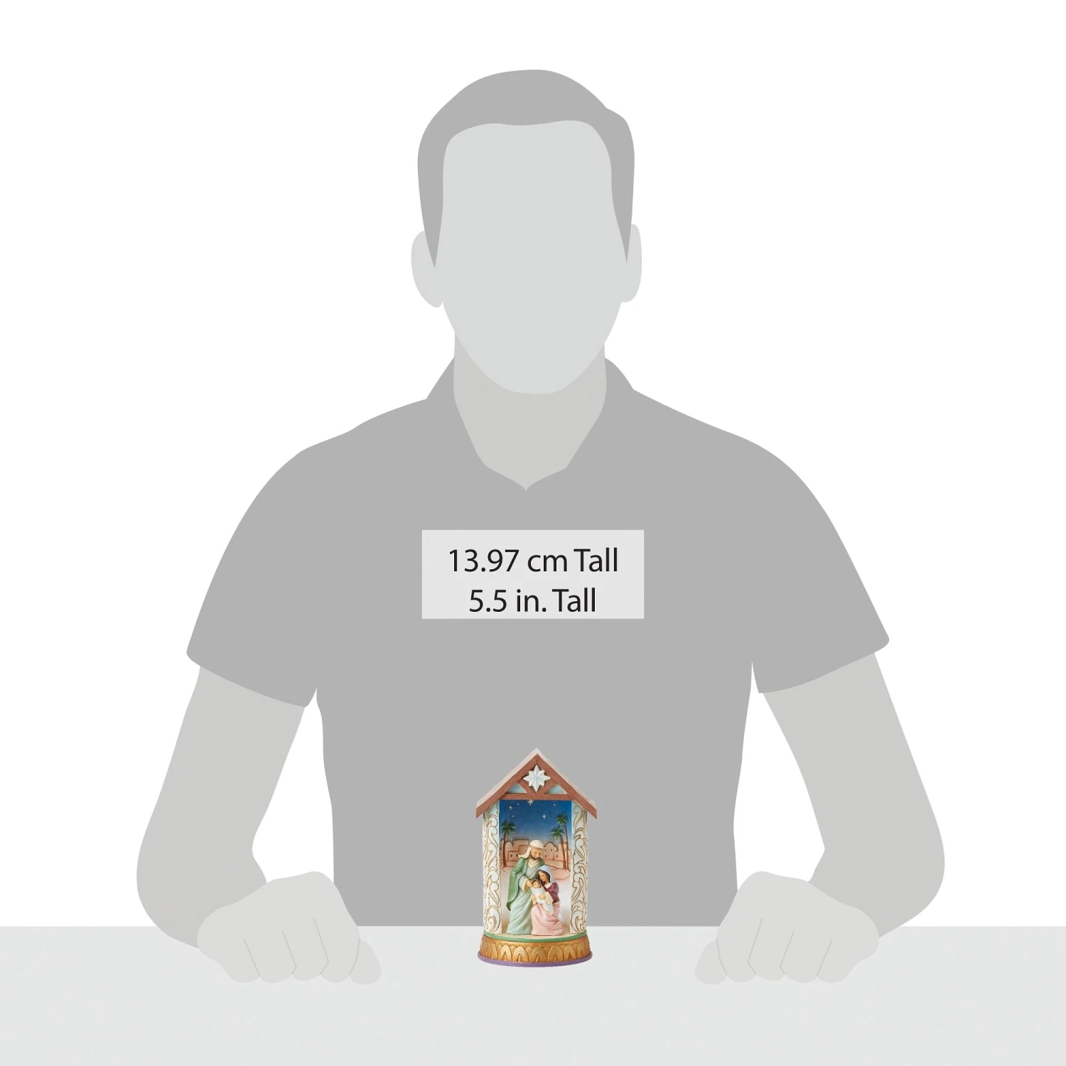 This lighted diorama by Jim Shore stands six inches with delicate detail and astounding craftsmanship. Within the manger crèche, new parents, Mary and Joseph hold Jesus lovingly under the Christmas star. A Bethlehem landscape completes the dome.