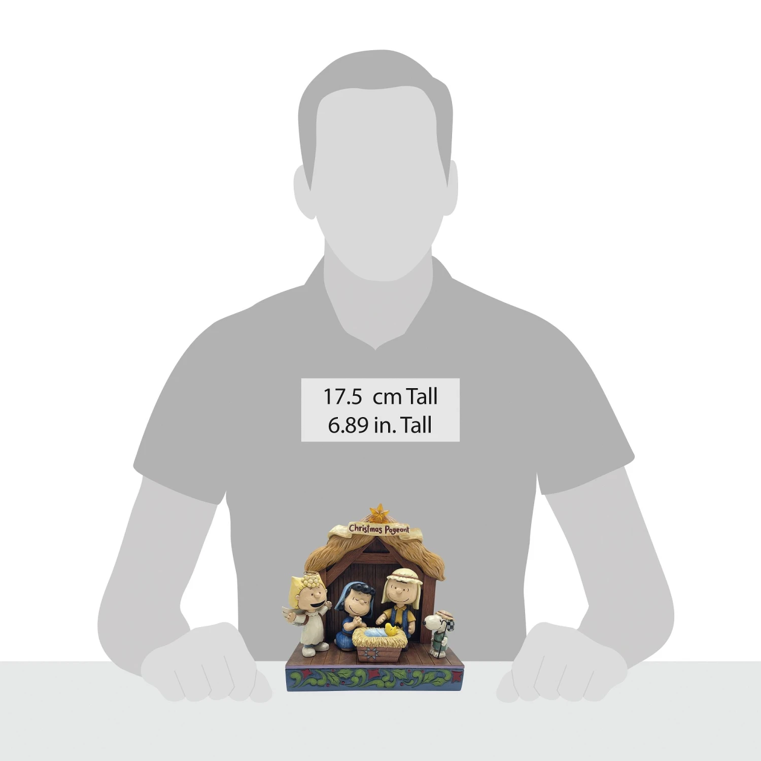 Jim Shore invites you to the Peanuts Christmas pageant! On a rosemale stage, Lucy and Linus sit in a manger dressed as Mary and Joseph tending to a Woodstock baby Jesus. Sally is dressed as an angel and Snoopy is a shepherd.