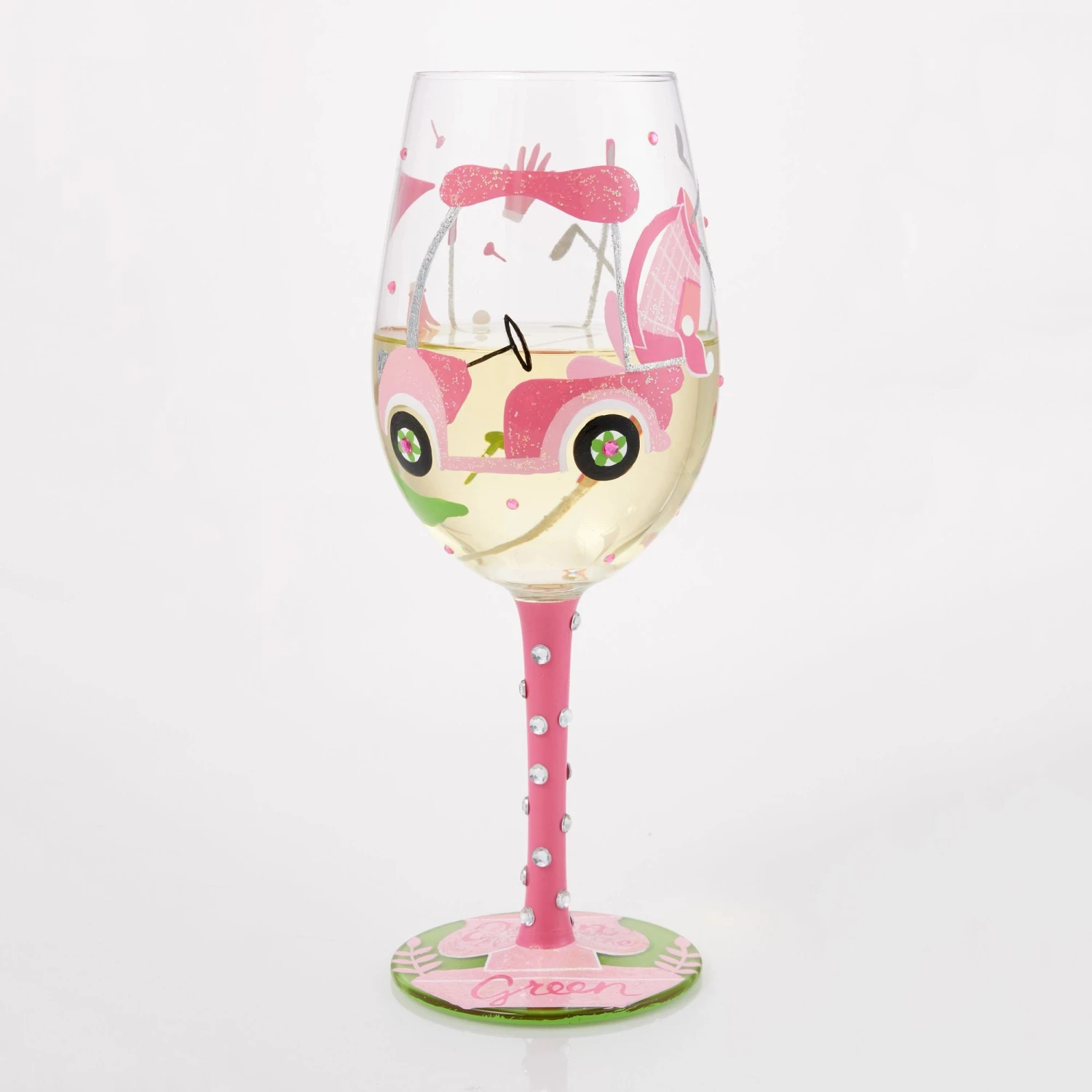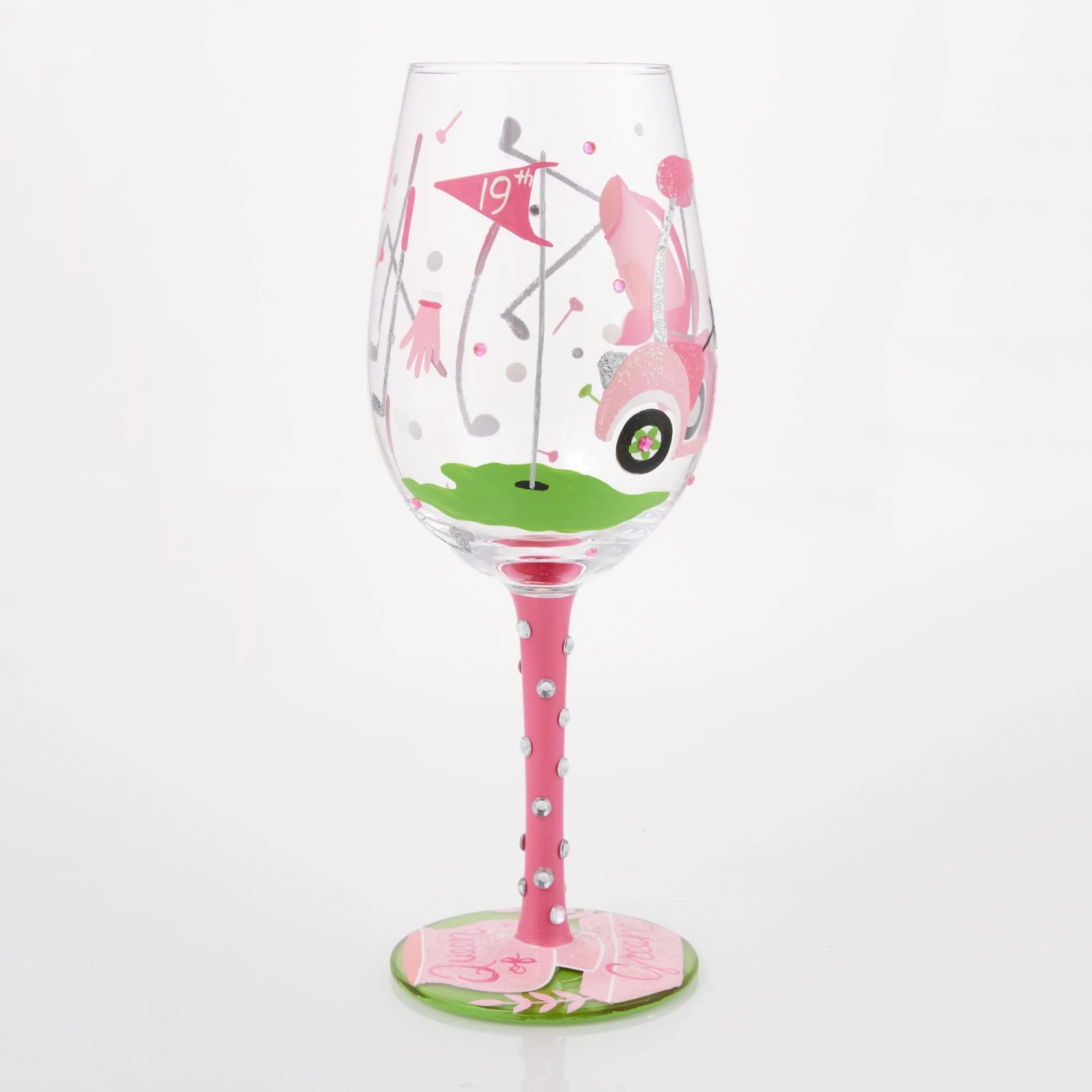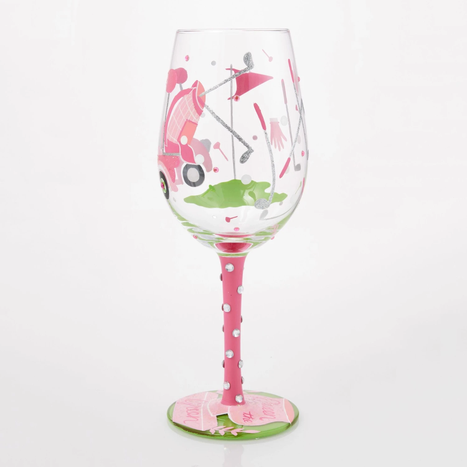 For the queen of the green, this Lolita wine glass celebrates her love of golf with golf clubs, a sparkling pink golf cart, and bedazzled crystals and glitter. Perfect for toasting all the way to the 19th hole, it’s a royal way to enjoy the game!
